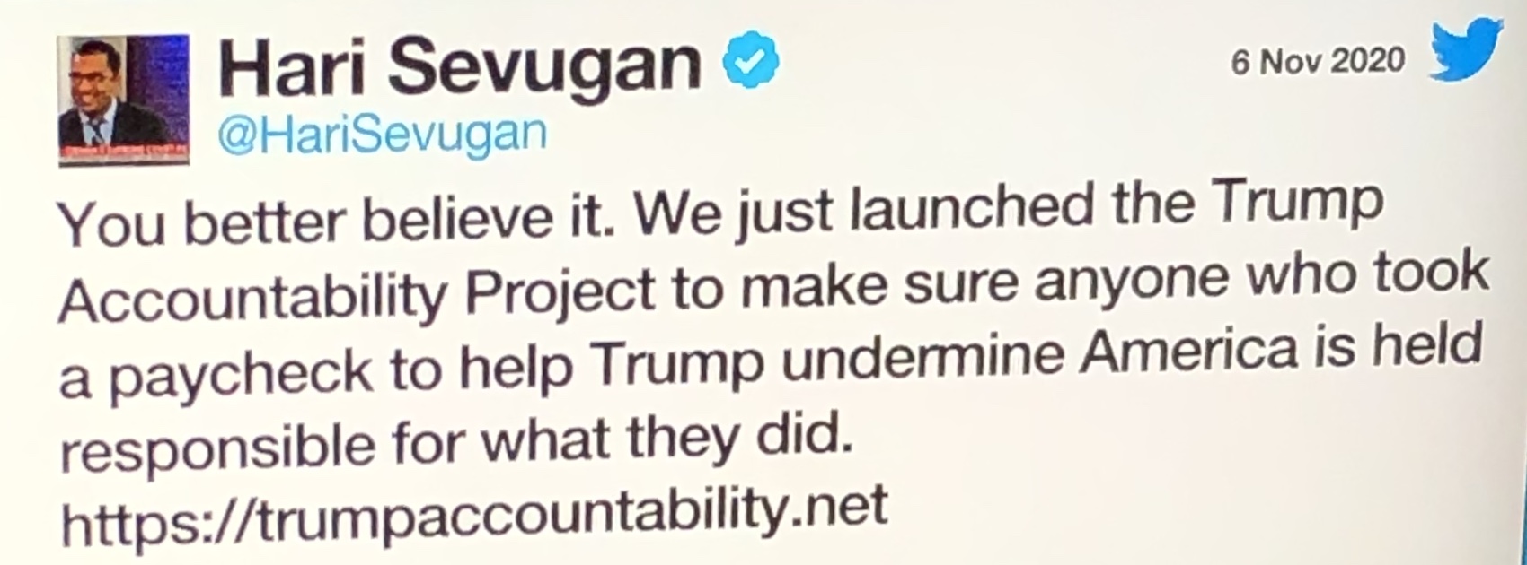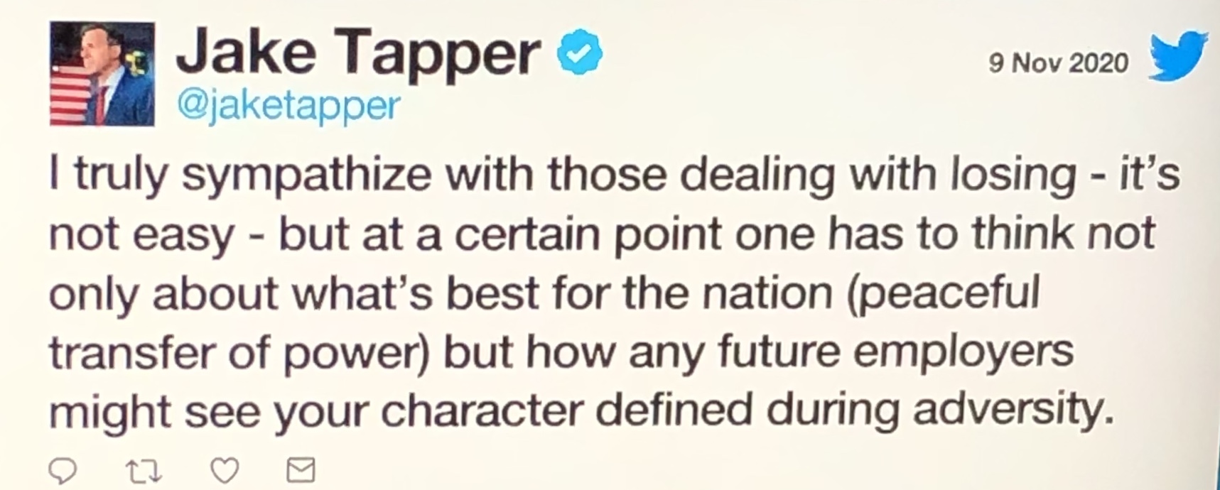 Sevugan’s threat is general. CNN anchor Jake Tapper issued a veiled threat against future employment. If you don’t accept the outcome (which has yet to be certified) you will have to face the consequences, he warned.