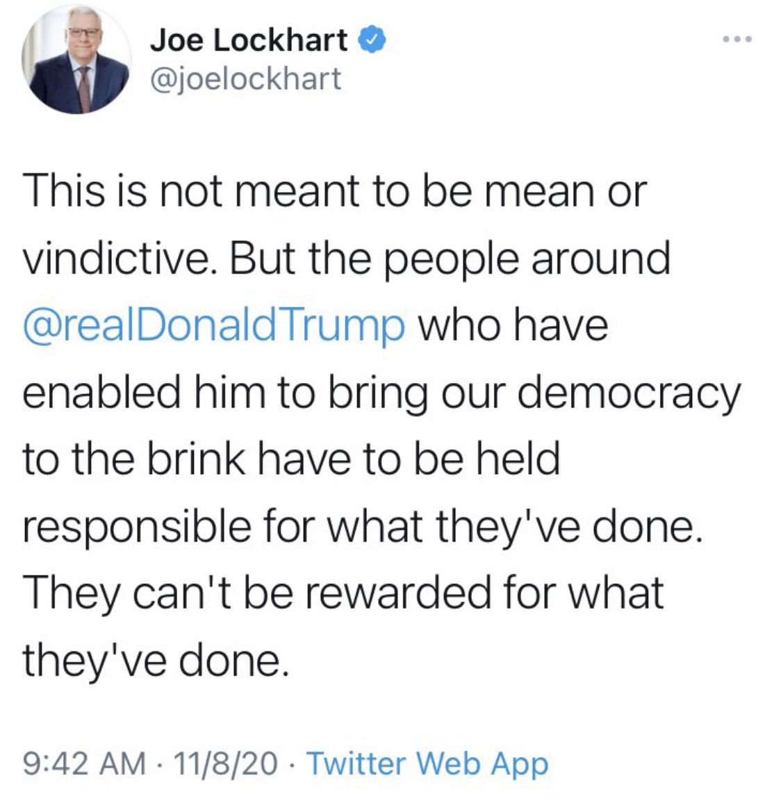 “This is not meant to be mean or vindictive,” said Joe Lockhart, Bill Clinton’s press secretary.