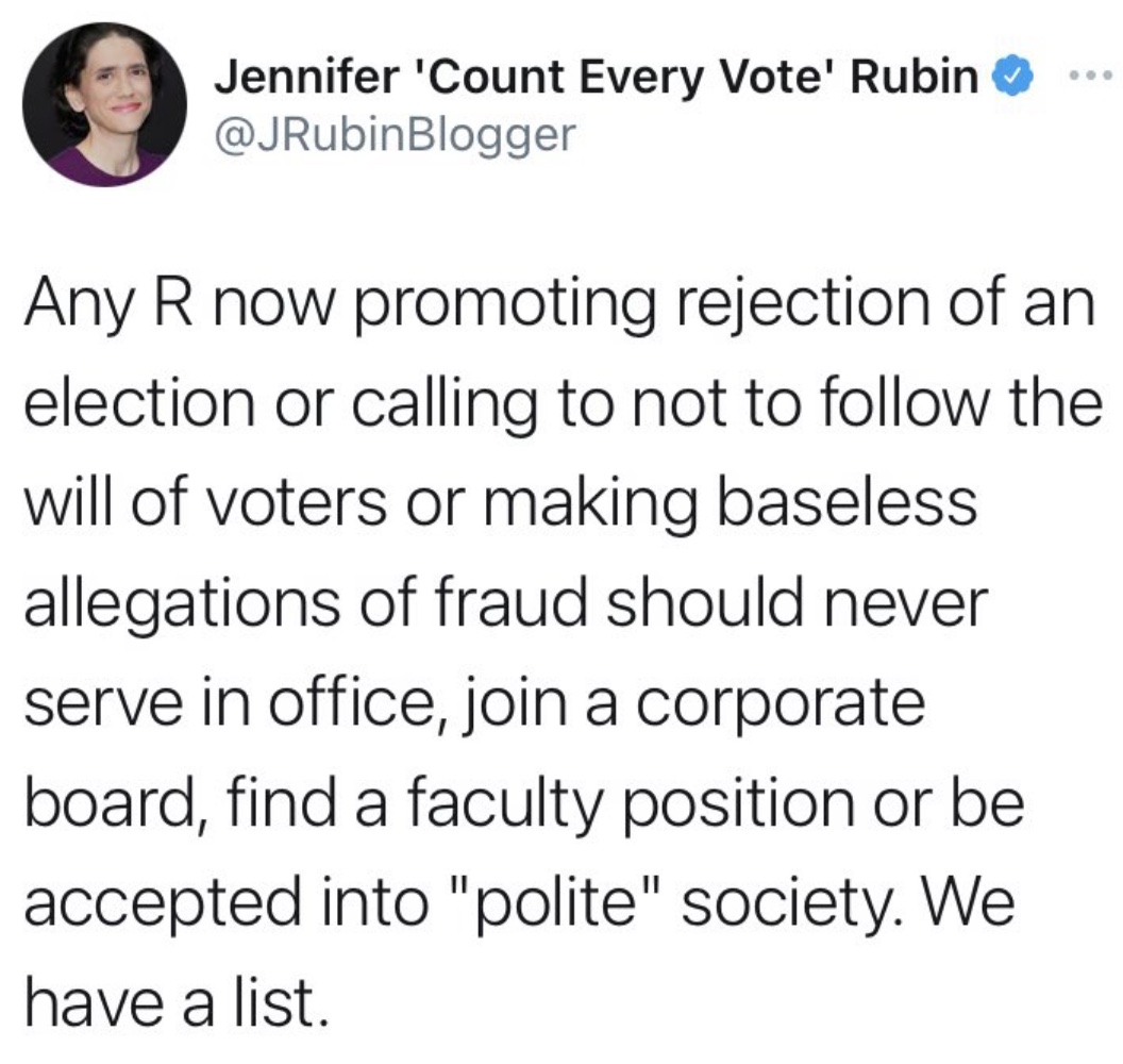 “We have a list,” she warns darkly. Maybe her employer, the Washington Post will print it. I’d like to see the names of the untouchables.