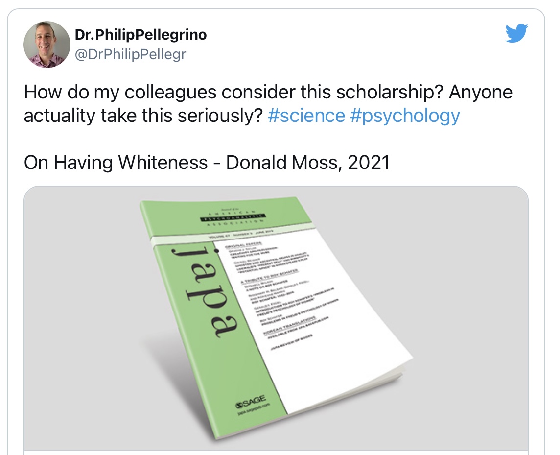 Meet Dr. Donald Moss, who recently published a “paper” titled “On Having Whiteness,” in the Journal of the American Psychoanalytic Association. The editor should have his head examined.