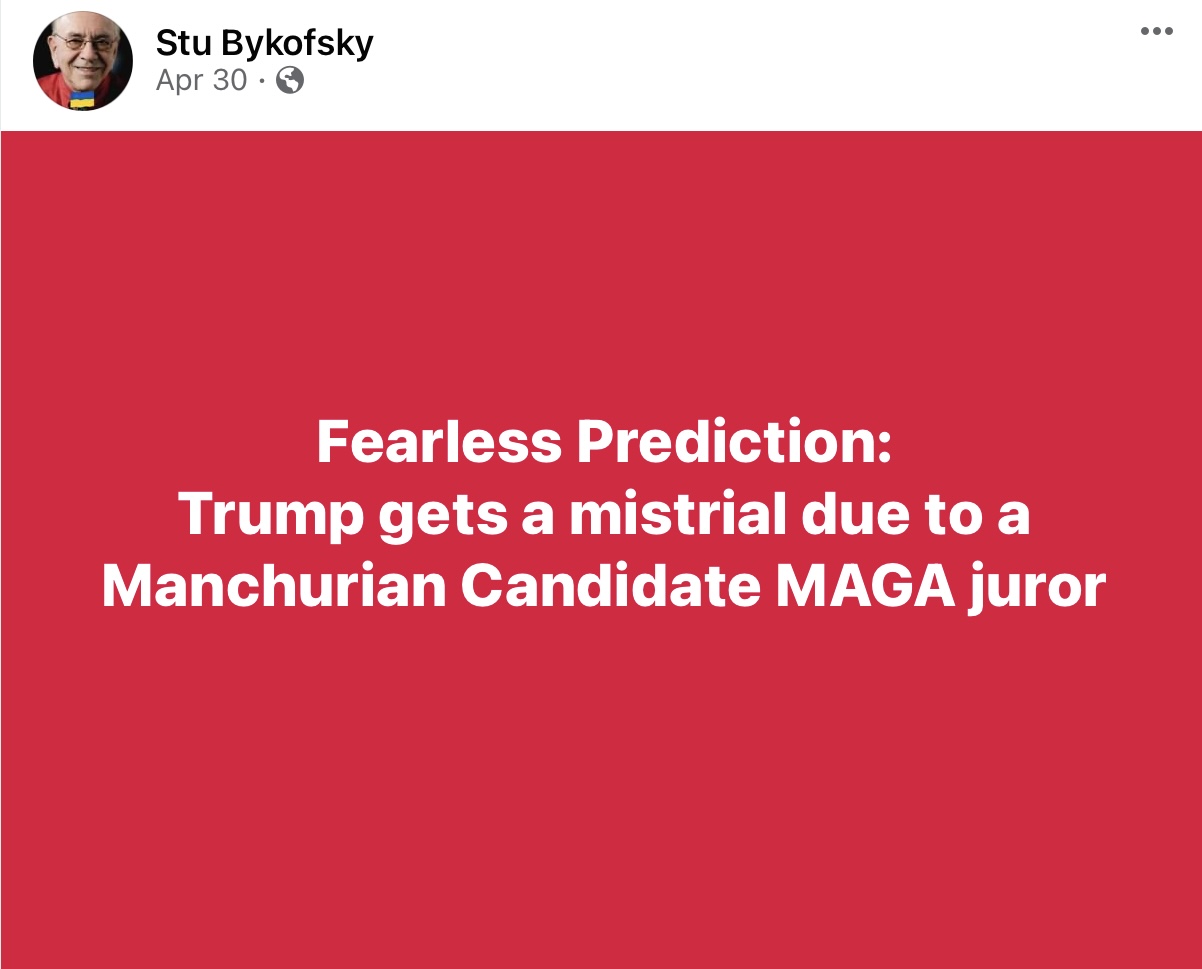 It was my way of saying some covert MAGA person would get on the jury and vote to acquit, no matter what. The jury would break 11-1, creating a mistrial.