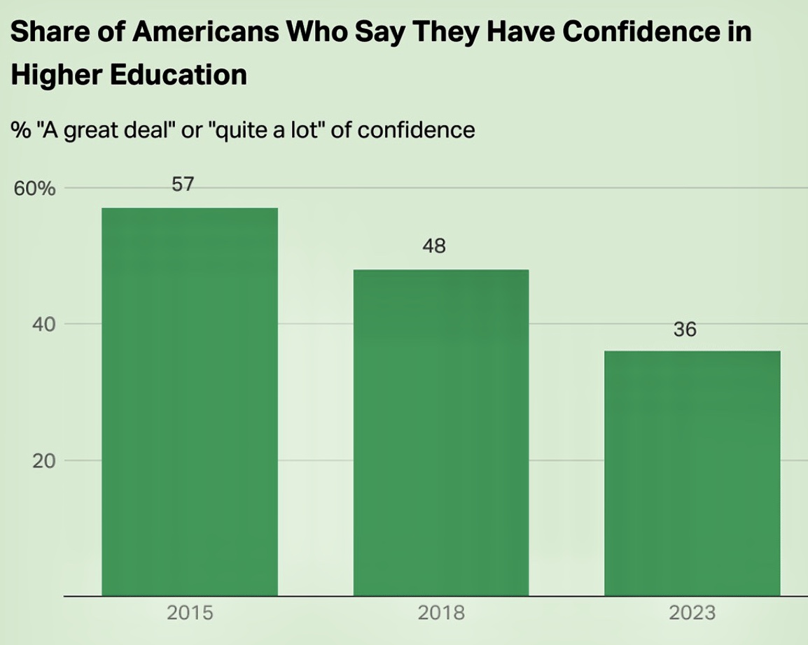 Gallup has just knocked the legs out from under that belief, with research that reports only 36% of Americans have confidence in higher education, down from 57% just eight years ago -- a serious decline of some 42%.