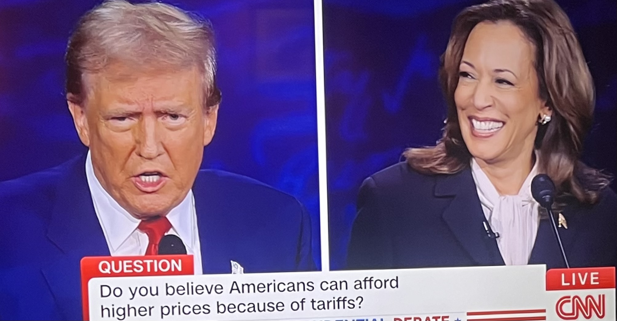 Harris scored the first point when she approached Trump at the open, extending her hand, saying, “I’m Kamala Harris.” Trump was forced to shake her hand.