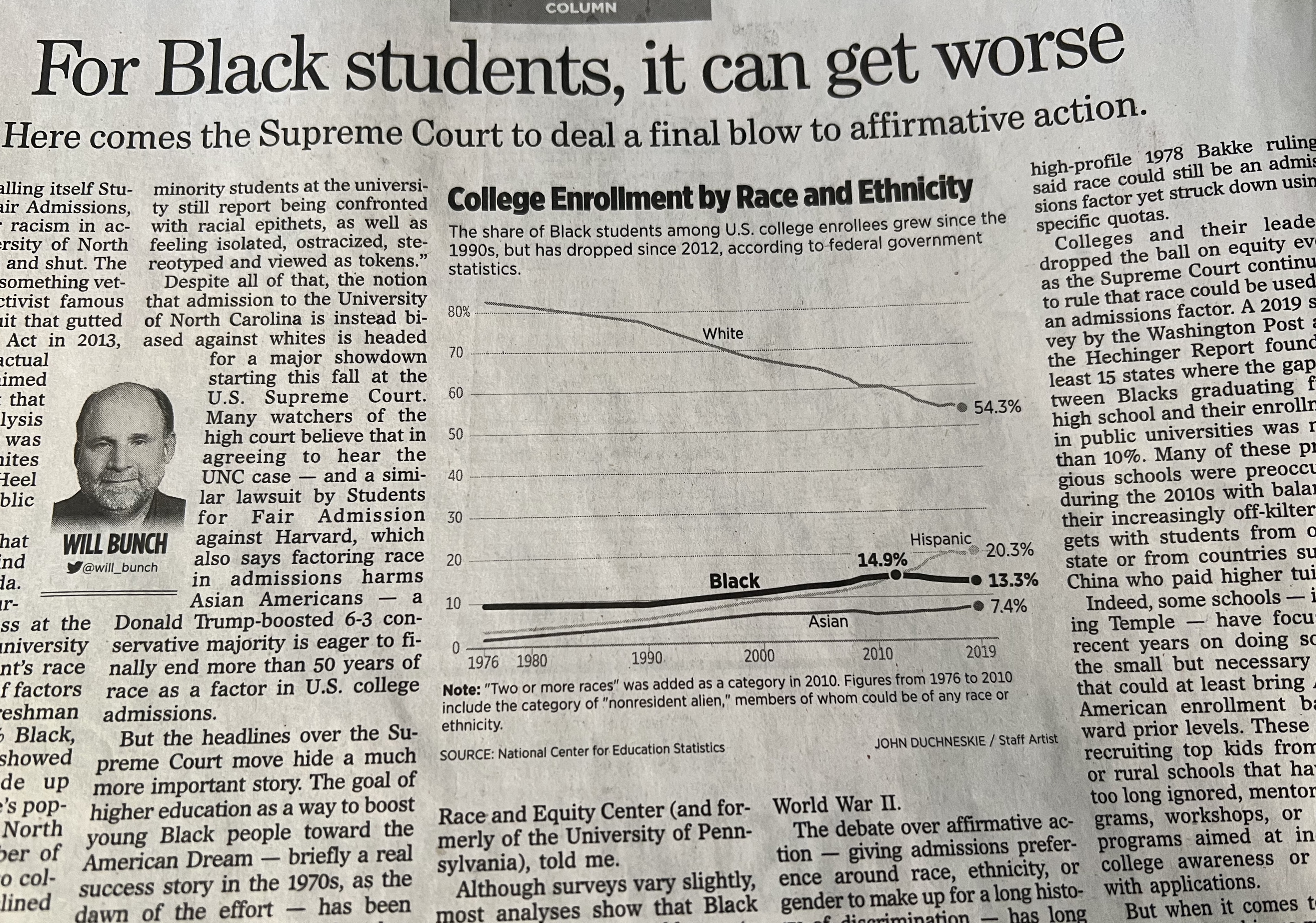 My former colleague Will Bunch recently wrote a heartfelt column about the declining number of African-Americans going to college. Such a decrease might be worrisome, and Bunch helpfully published a graph to illustrate the column. l